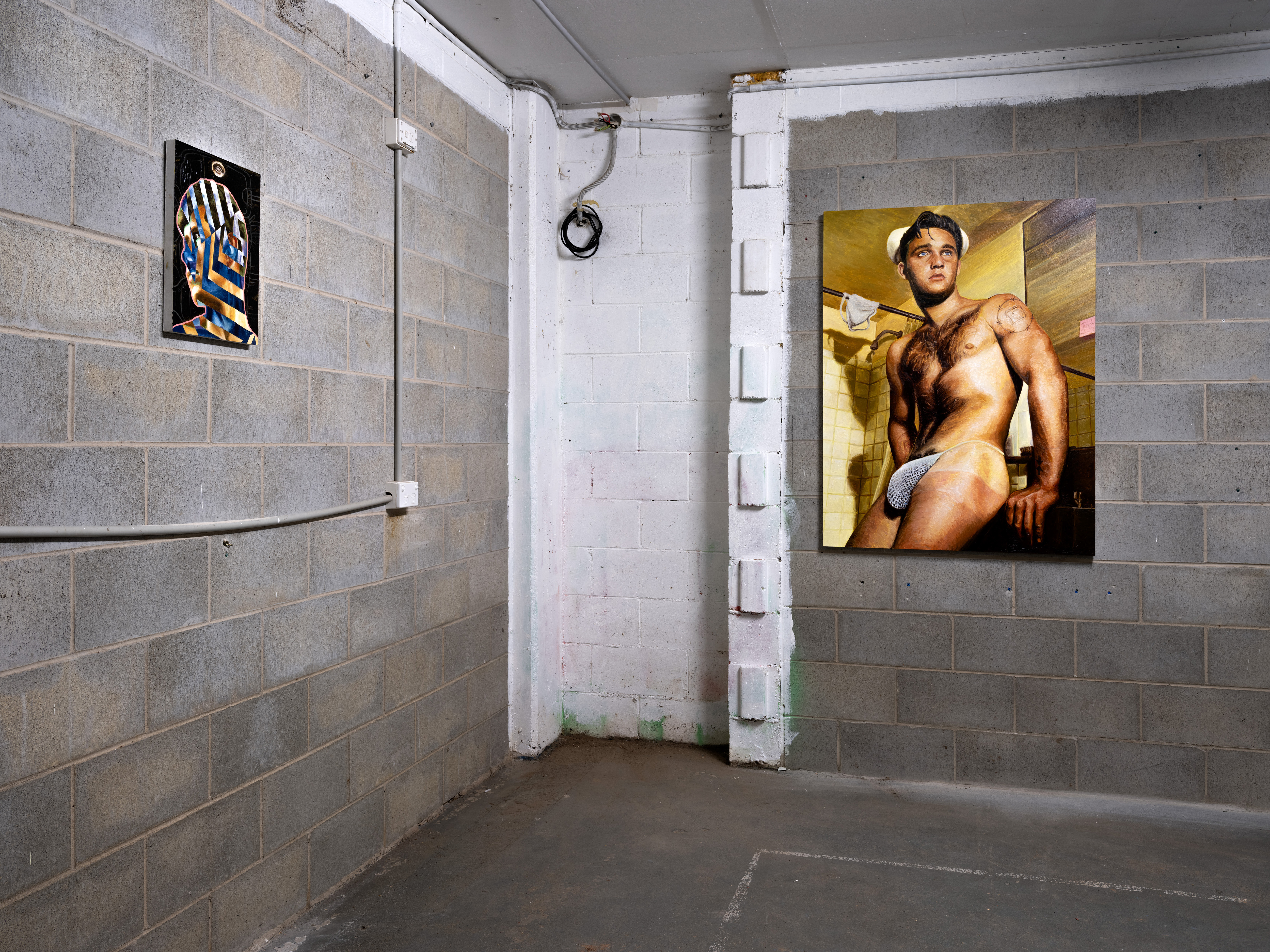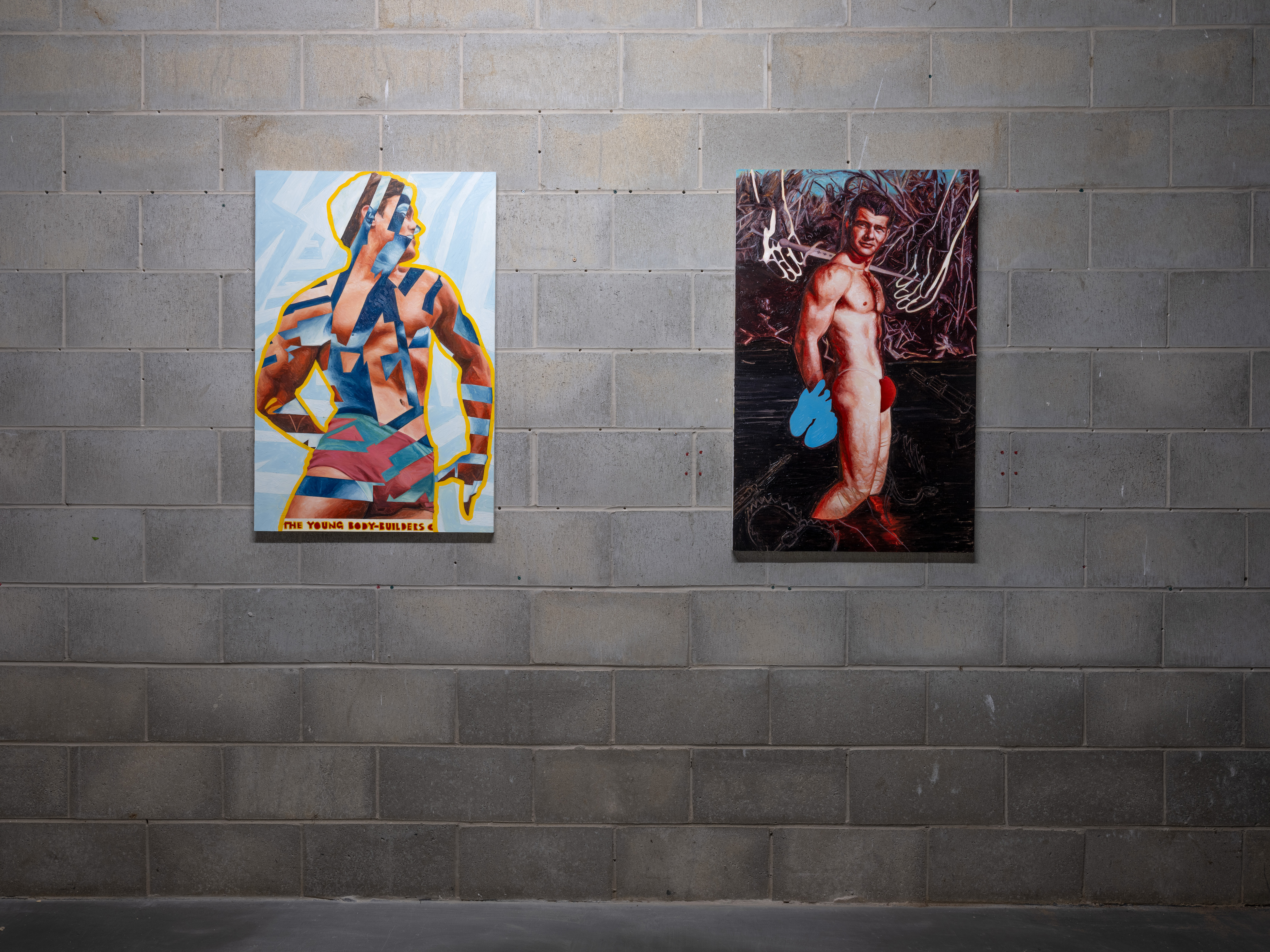 In ‘Vaseline’, Darcy Williams delves into queer stories that are usually ‘hidden’ among public consciousnesses, seeking to underscore and make visible what has been neglected by history. The artist is directly inspired by mid-century physique — or ‘Beefcake’ — magazines, which displayed erotic masculine imagery under the guise of health and fitness to avoid scrutiny and government censorship. Drawn to the beauty of these images and their then-unstated role as havens for queerness, Williams paints and re-stages the figures from within these pages, imbuing them with a heightened sense of history.