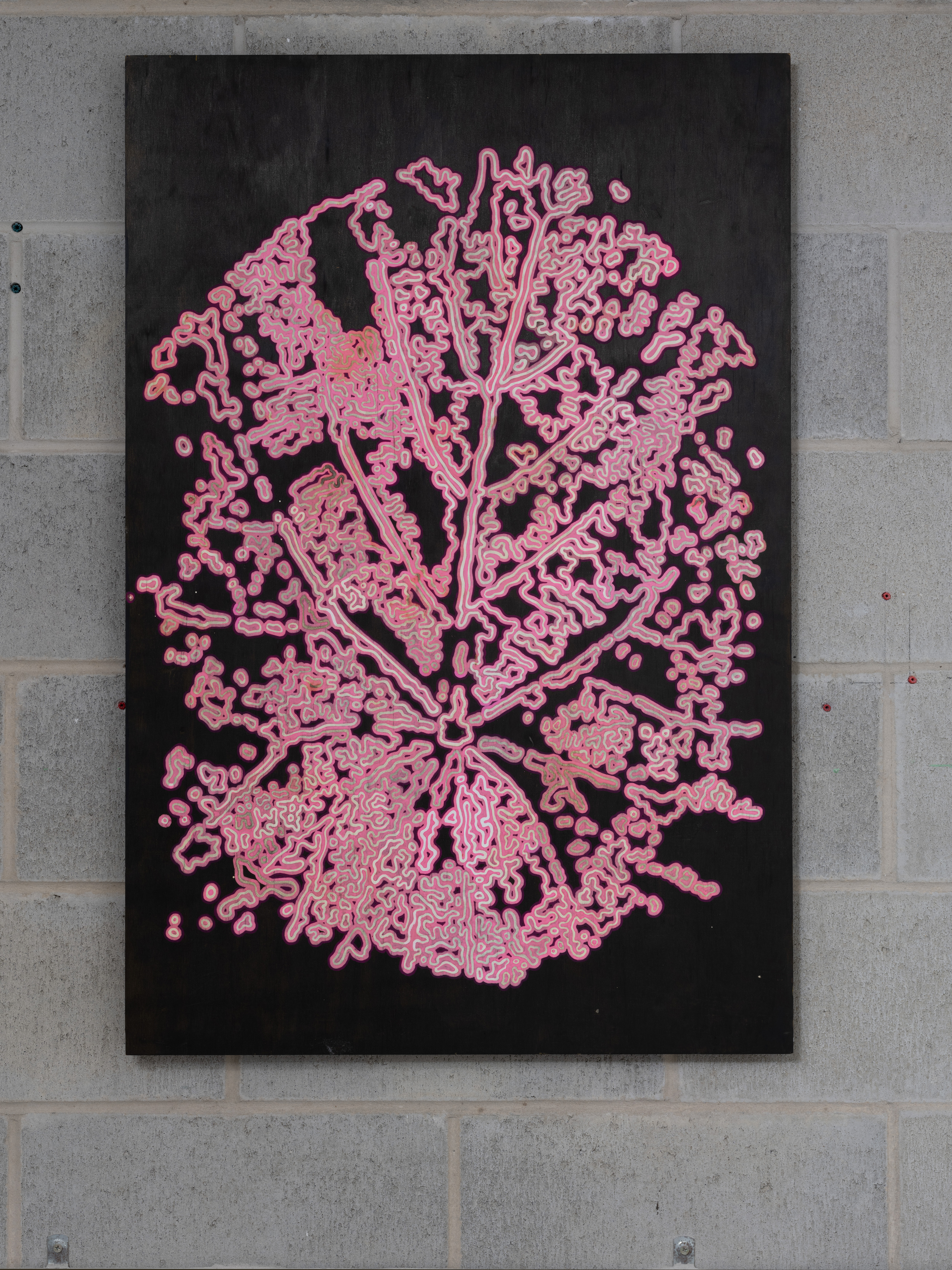 Dylan Bolger is a proud Maiawali, Karuwali, Pitta-Pitta and Gomeroi artist. Over the past three years Dylan has been working on the Leaf SZN project; creating 100 works based on the macaranga leaf. The macaranga is a pioneer species, meaning it is one of the first to repopulate and breathe new life into areas that have experienced environmental devastation. Leaf SZN is part of Dylan’s mission to recolonise Australia through art. To keep track of his progress, he records where every work from the series has travelled on a map.