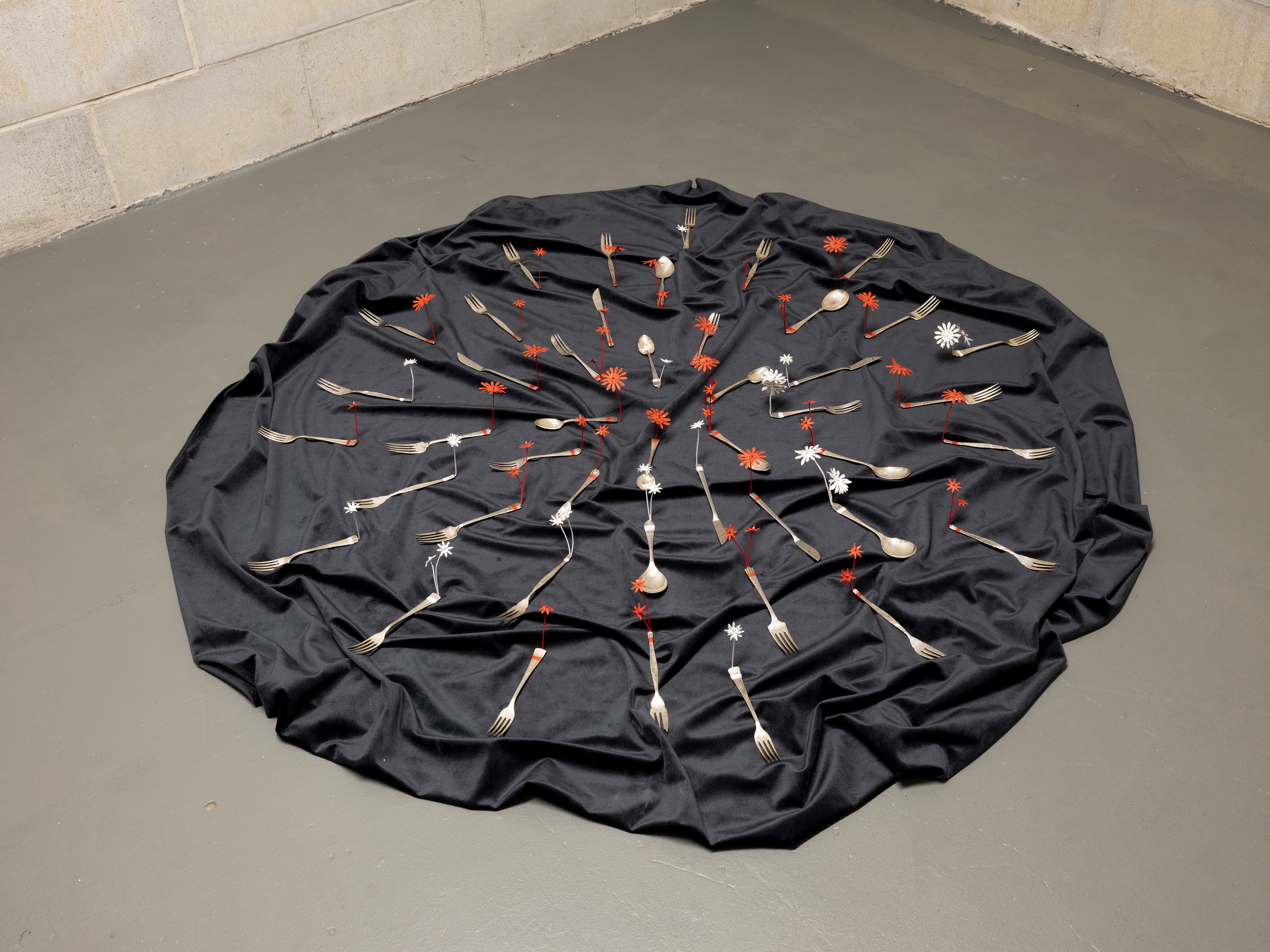 While simultaneously being dispossessed from land and waters and having children stolen, our words were served up with no connection to people or place for leisurely consumption of colonists. Linguistic Prosperity Vol.2 takes this fraudulent book and transforms it using settler tableware and focusing on methods of cyclical elemental deconstruction and reconstruction (fire), creation and appropriation.