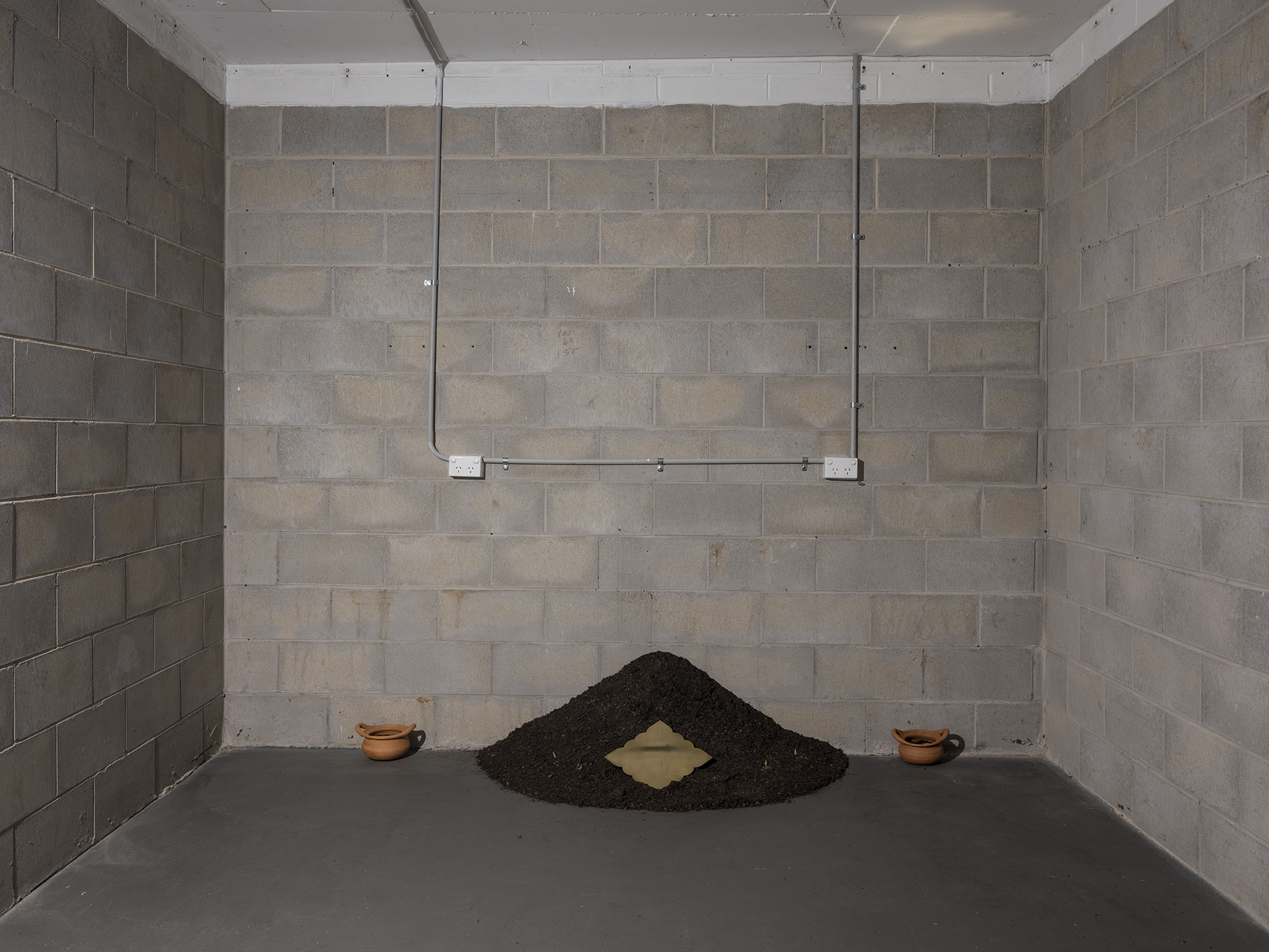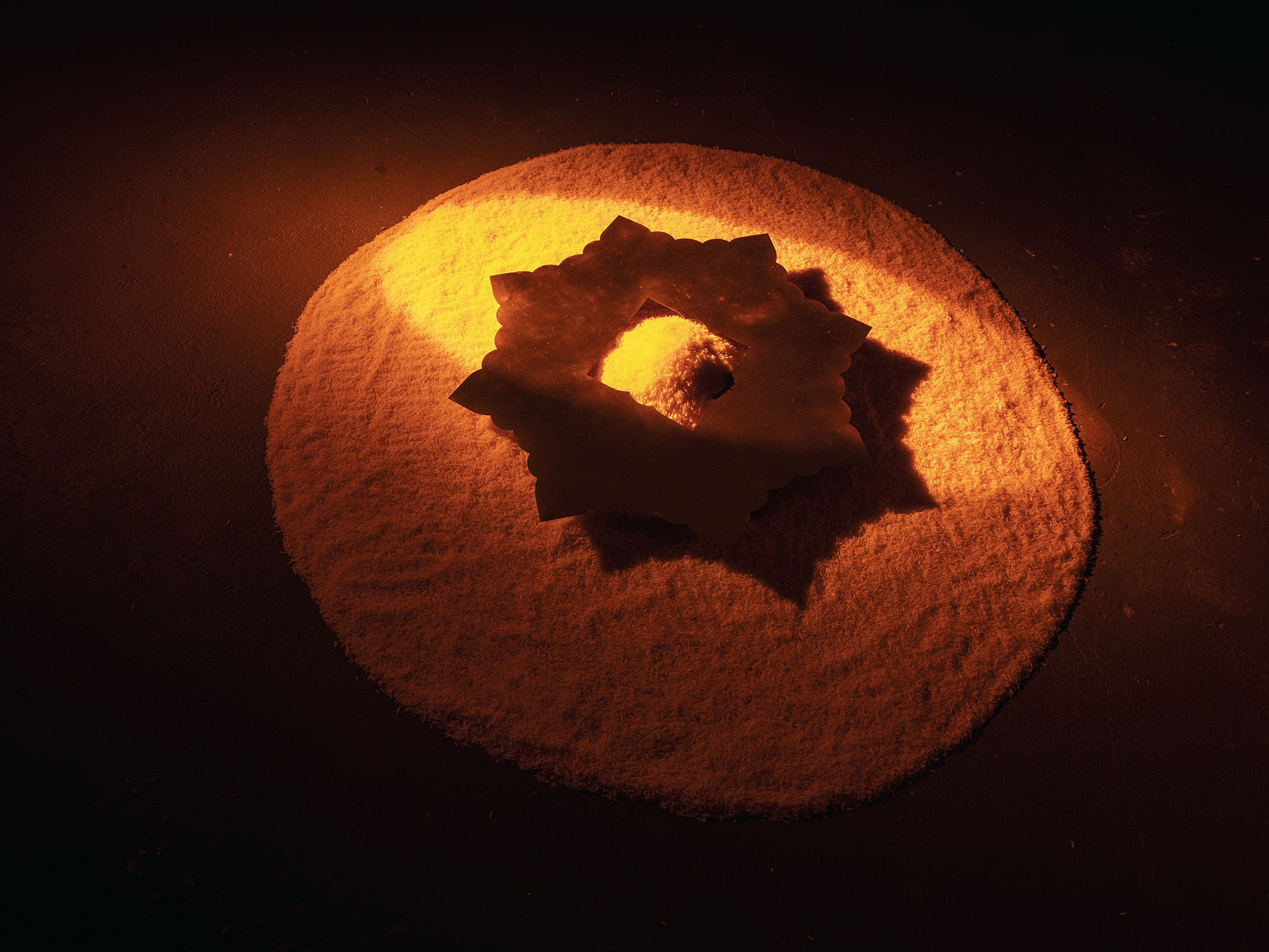 Inspired by the Hindu ritual Śrāddha, this exhibition marks the first death anniversary of my mother’s passing. Conceptually, the rice and turmeric infused oil are offerings of nourishment and healing, while the brass objects emulate the sunrise viewed from my mother’s hospital bed the morning she passed. Audiences are invited to meditate on the recorded breath of my mother and light a candle for a loved one.